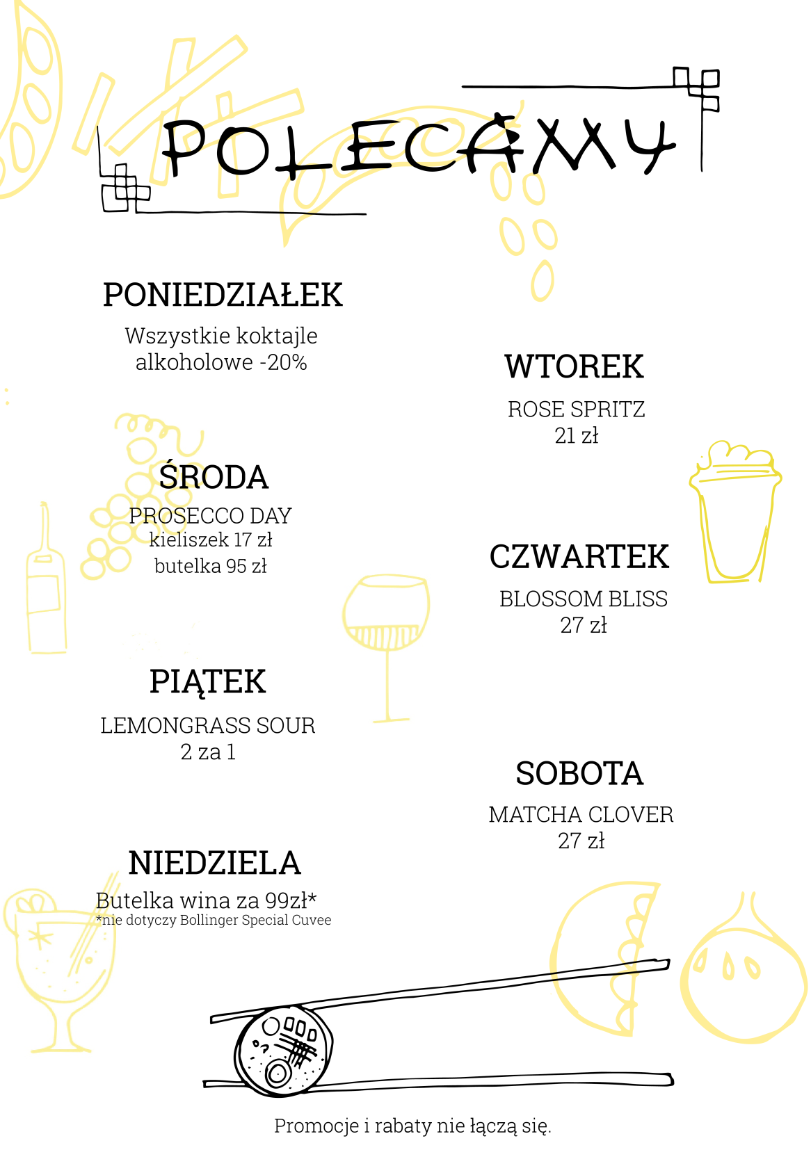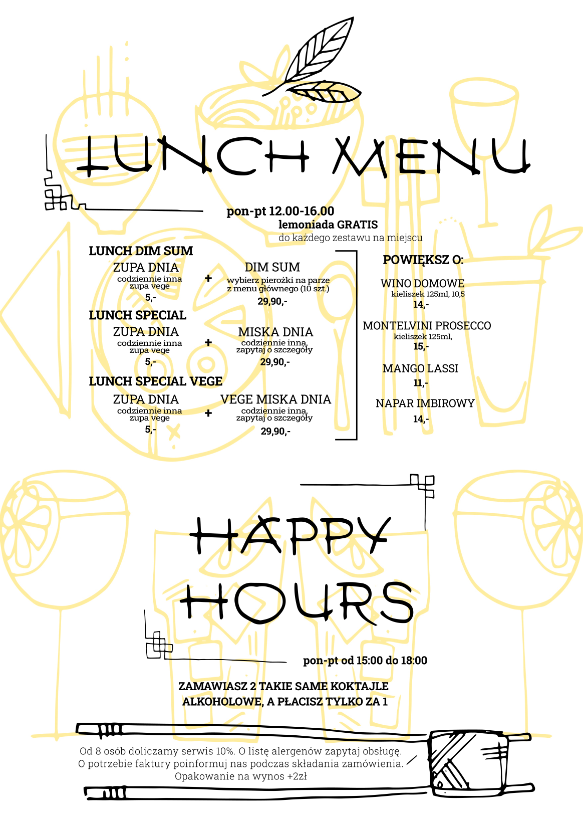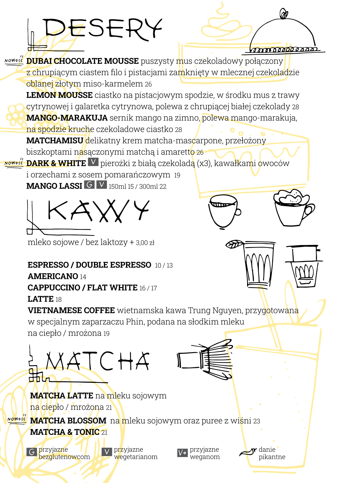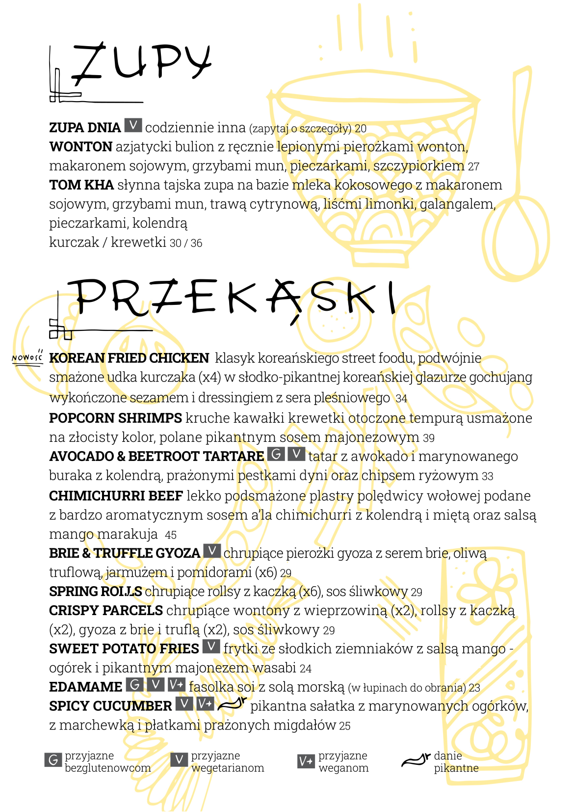 Wierzymy, że najwyższa jakość składników używanych do przygotowywania dań jest kluczowa. Wszystkie dania są przygotowywane w kuchni, w której wykorzystuje się orzechy, gluten, soję i inne alergeny. Z tego względu nie możemy zagwarantować, że którekolwiek z naszych dań jest całkowicie wolne od tych alergenów. Więcej informacji o składnikach naszych dań uzyskasz w restauracji.